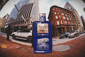 Old newspaper dispenser shot with fish eye lens